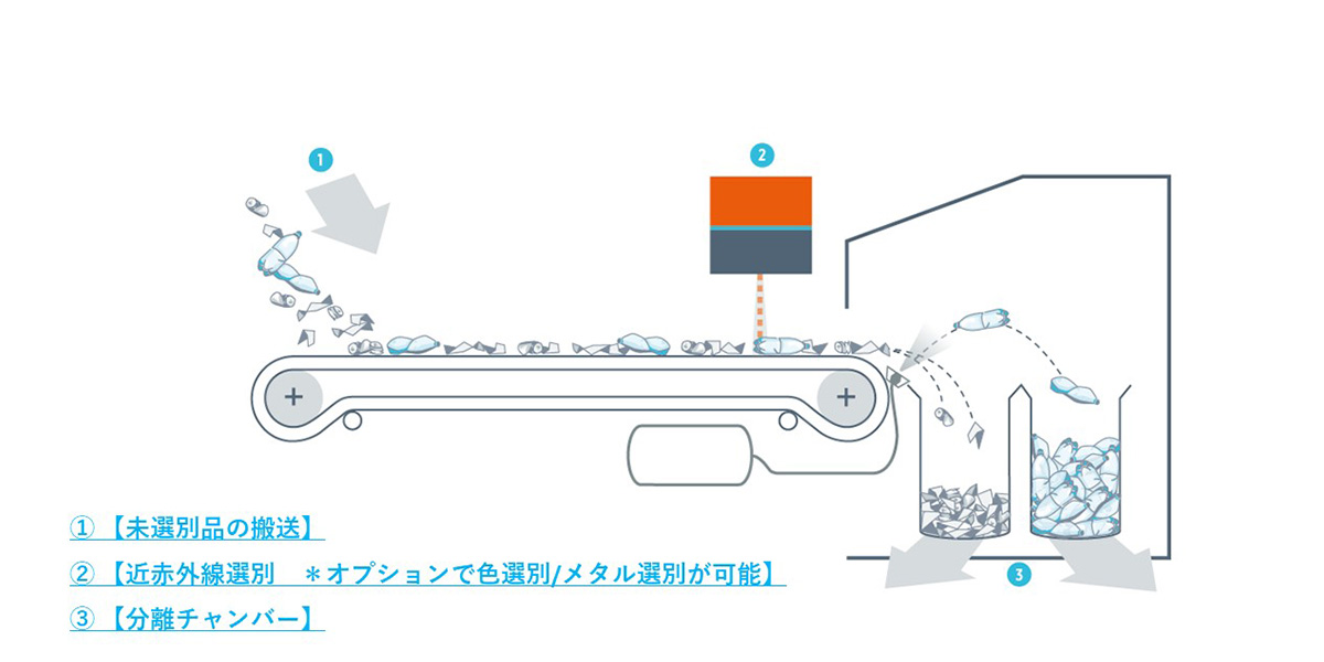 「光学式選別機」は、様々なハイテクセンサーがベルト上の資源を「PETボトル材質・色選別」「PP・PE・PSの選別」「PVC除去」等、材質と色を同時に判断し、エアージェットにて選別します。